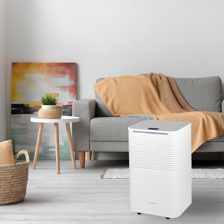 Turbionaire EPI 12 WIFI is een luchtontvochtiger die tot 12 liter water per dag kan verwijderen, compact, met een matte witte afwerking en aandacht voor detail, eenvoudig te gebruiken dankzij het touch-bedieningspaneel.