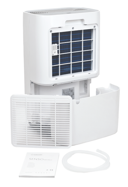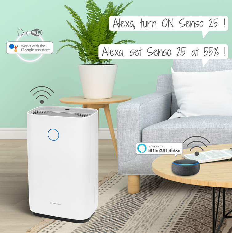 Turbionaire: slim lucht ontvochtigen Compact, stijlvol en eenvoudig te gebruiken, SENSO 25 WIFI is een compacte en krachtige compressortype luchtontvochtiger, met 3-kleuren LED-vochtigheidsindicatorlampje. 4 liter watertankcapaciteit, digitaal display en elektronische hygrostaat. SENSO 25 WIFI is perfect voor elke kamer in huizen of kantoren en kan op afstand worden bediend met behulp van de smartphone-app, Smart Life (beschikbaar in Play Store en App Store) LED-vochtigheidsniveau-indicator De LED-indicator aan de voorkant, in drie kleuren, informeert u over de luchtvochtigheid in de kamer. De informatieve LED-indicator van Turbionaire SENSO 25 WIFI heeft een ronde vorm. De kenmerken van Turbionaire SENSO 25 WIFI Verwijdert tot 25 liter water per dag WIFI-verbinding met Smart Life-app compatibel met spraakassistenten van Amazon, Google. Zeer stil voor deze capaciteit, slechts 45 dB (alleen wanneer de compressor werkt) Wasbaar luchtfilter, zeer eenvoudig te verwijderen en te wassen Automatisch opnieuw opstarten na stroomuitval Kinderslotfunctie Elektronische hygrostaat Continue afvoeroptie, handig voor intensief gebruik Multidirectionele wielen voor eenvoudig transport