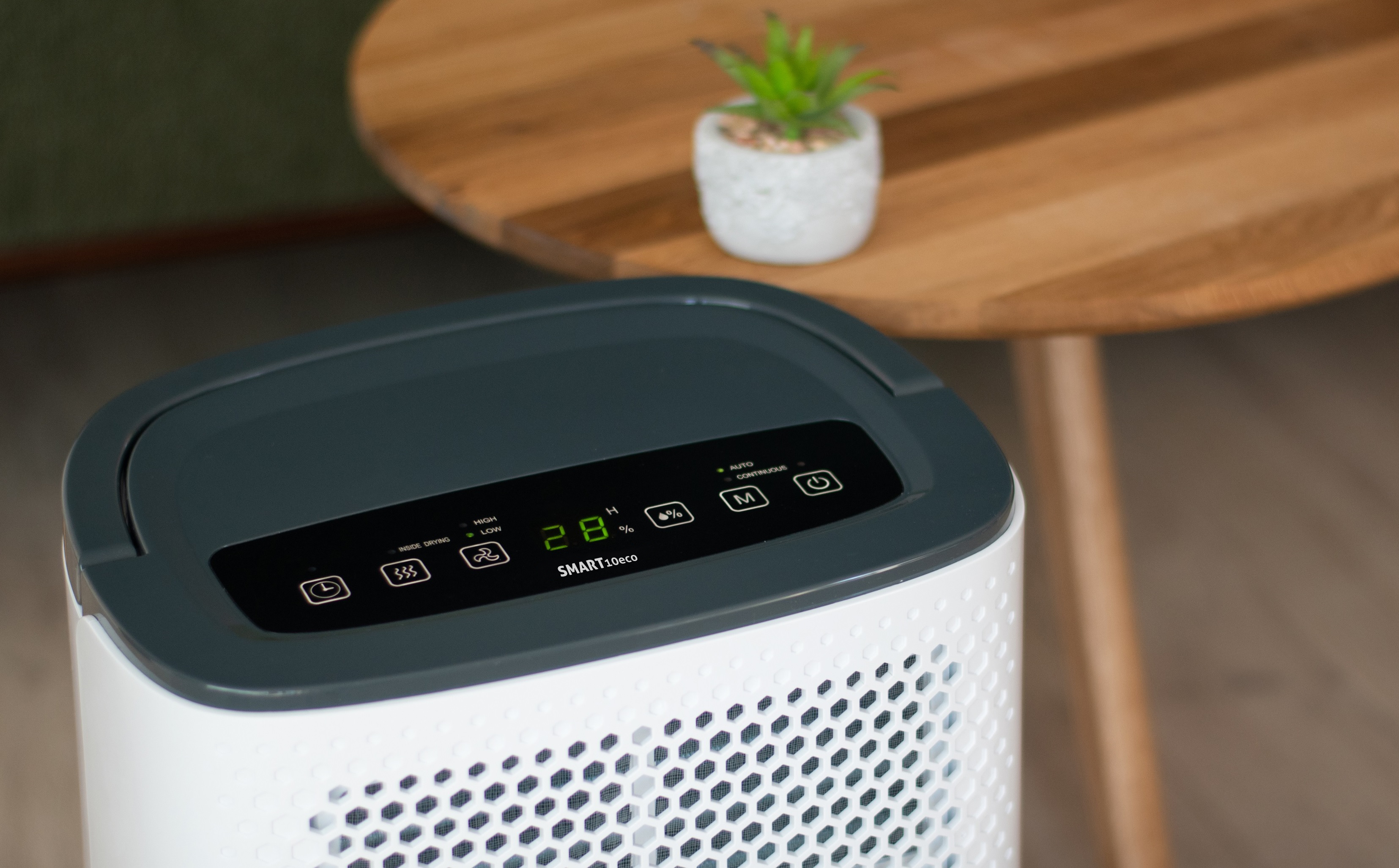 Compact, stijlvol en gemakkelijk te gebruiken, SMART 10 eco is een kleine maar krachtige compressor type ontvochtiger op onze lijst. Met een ontvochtigingscapaciteit van 10 liter/dag is het perfect voor elke kamer, in uw huis of op kantoor.